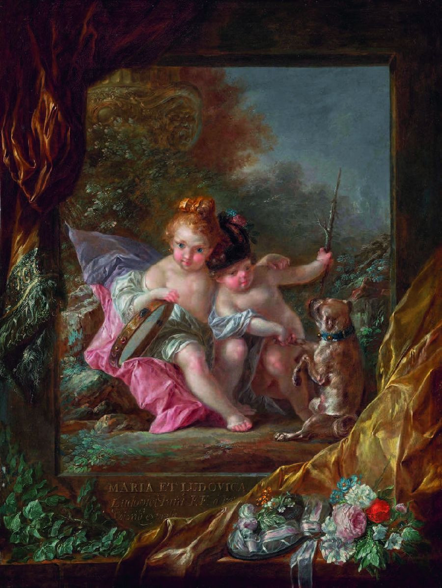 Las protagonistas son María y Luisa, hijas del pintor, de tres y dos años respectivamente. Paret las representa como pequeñas ninfas en un paisaje natural: María sostiene una pandereta y abraza a su hermana, mientras Luisa juega con un perrillo y luce una chichonera. La escena, en plena naturaleza, conecta con las ideas educativas de Jean-Jacques Rousseau, influyentes en el ambiente ilustrado que el artista conocía bien.