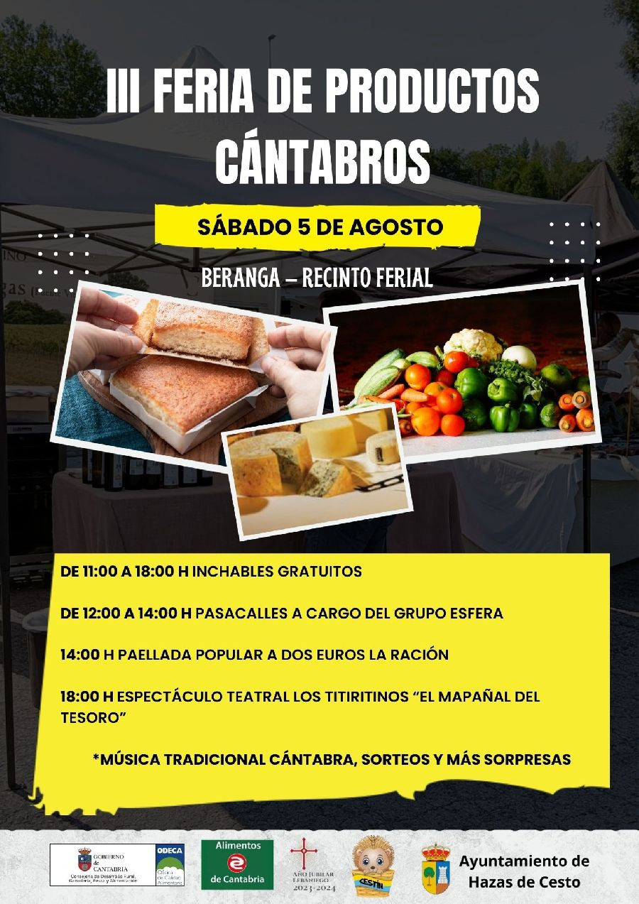 El recinto ferial de Beranga acogerá el sábado 5 de agosto la III Feria de Productos Cántabros, que contará con diferentes productos elaborados en la región como quesos con denominación de origen, sobaos y quesadas, verduras, patatas, fruta, leche, vinos, orujos, sidras, zumos, repostería, mermeladas, embutido, pan o miel.