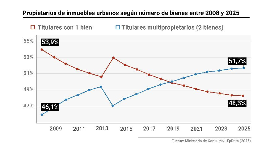 En 2008, la mayoría de los propietarios tenía un solo inmueble (53,9%), mientras que el 46,1% poseían dos o más. En 2025, esta relación se ha invertido: los propietarios con un único inmueble representan el 48,3%, frente al 51,7% que tienen dos o más.