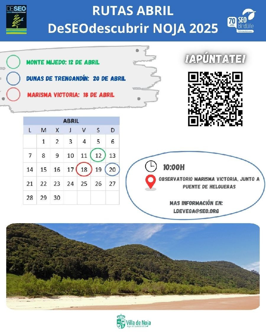 El Ayuntamiento de Noja y SEO/BirdLife comienzan este sábado las rutas ornitológicas DeSEOdescubrir Noja 2025, un programa gratuito que invita a descubrir los ecosistemas del Parque Natural de las Marismas de Santoña, Victoria y Joyel.