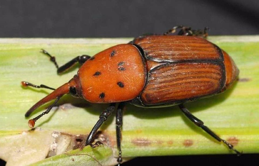 Procedente del Asia tropical, este insecto presenta, en su fase adulta, un color rojizo ferruginoso con manchas negras en el protórax. Desde su cabeza se extiende un pico largo y delgado en el que se encuentran las antenas y mandíbulas.