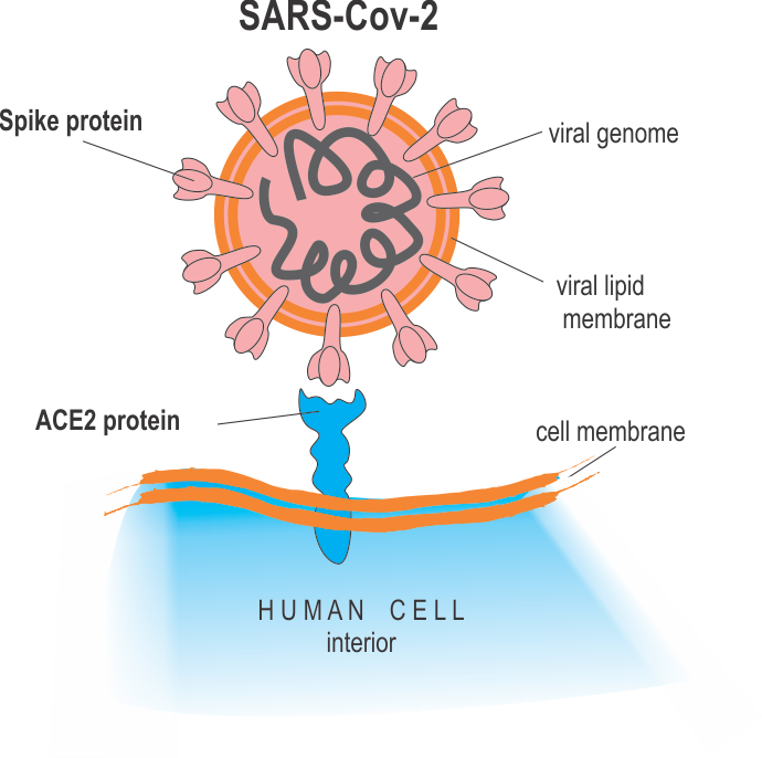 El interior de la nariz y la garganta contienen abundantes receptores de la enzima convertidora de la angiotensina 2 (ECA2), “puertas de entrada” del virus SARS-CoV-2 en nuestro organismo. Esta enzima ECA actúa sobre el sistema renina-angiotensina-aldosterona, sistema hormonal complejo del riñón, hígado y glándula suprarrenal, que regula la presión sanguínea, el volumen extracelular corporal y el balance de sodio y potasio. En algunos órganos -corazón, pulmón, riñón-, las paredes internas de los vasos sanguíneos -endotelio- y la sangre, la angiotensina I se convierte en su forma activa angiotensina II, que activa la presión arterial. Esta importante transformación bioquímica es producida por la ECA2.