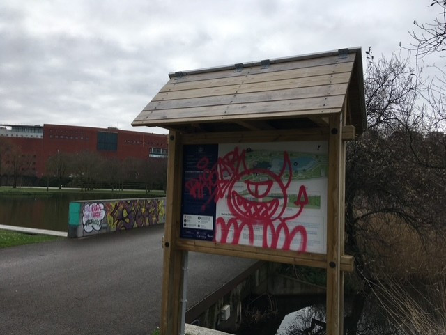 Pero siempre tienen que aparecer los vándalos, los que no respetan nada, los que no han recibido educación de sus padres y su único disfrute es destrozar todo lo que puedan dejando su huella. Debido a su escasa inteligencia y escaso conocimiento, no valoran lo que el parque les ofrece, no respetan los carteles, los muros, las papeleras, nada que se les ponga por delante y que puedan dañar. No me vale que me digan que son jóvenes y no saben lo que hacen, porque bien saben comprar los sprays para pintarrajearlo todo.