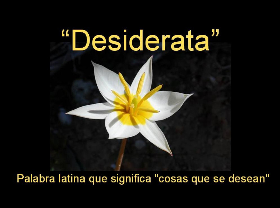 Desiderata es un poema sobre la búsqueda de la felicidad en la vida, escrito por Max Ehrmann (1.872-1.945) y publicado en 1.948 por su esposa, una vez fallecido, en una colección de poemas llamados Desiderata of Hapinness.