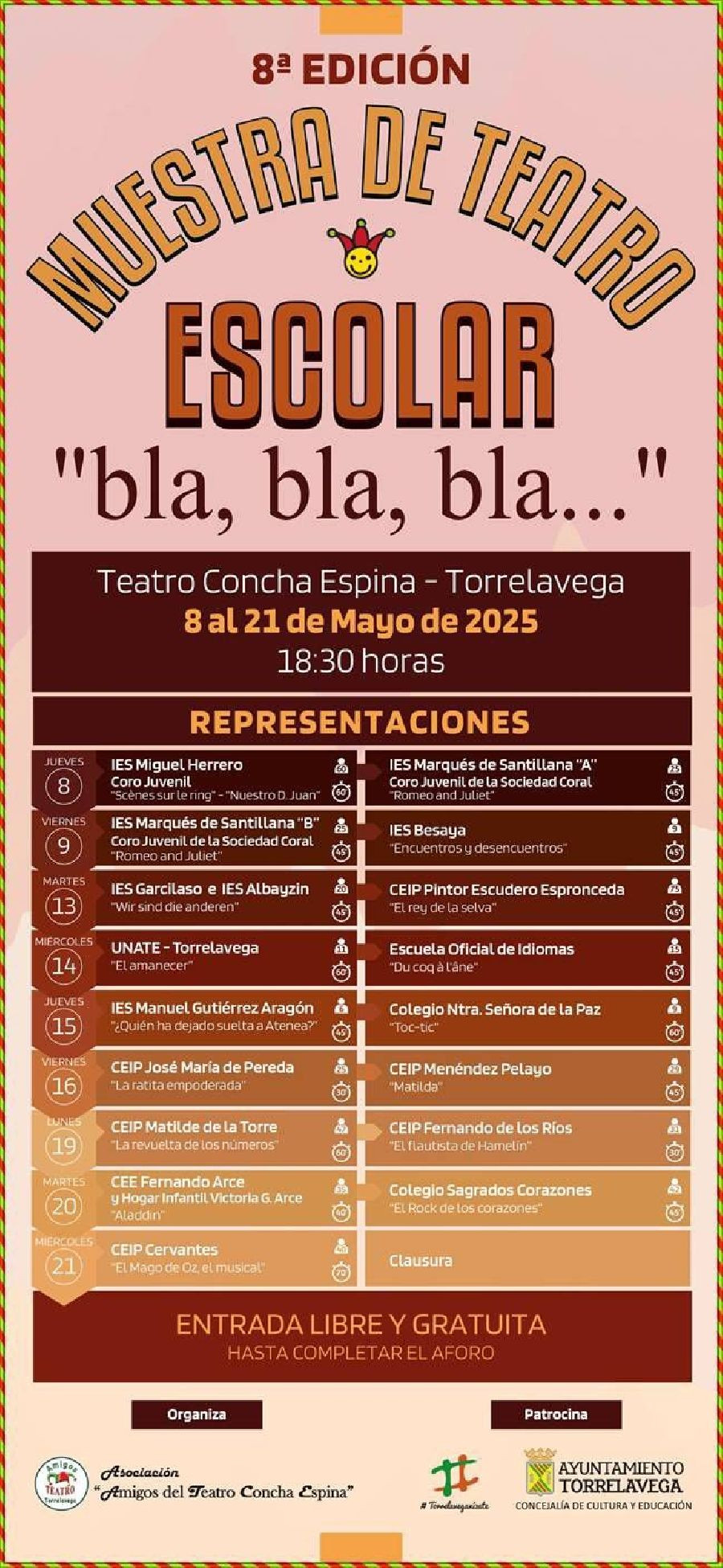 El Teatro Municipal Concha Espina de Torrelavega acoge desde este jueves, 8 de mayo, y hasta el día 21 la VIII Muestra de Teatro Escolar `Bla, bla, bla...`, con la participación de 564 alumnos.
