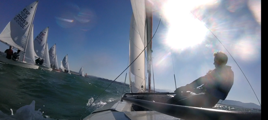 Poco antes de las 12, el viento comenzó a entrar del Sur, con lo que se izo un aplazamiento, y el comité modificó su fondeo, para dirigirse a la Duna, desde donde volvió a instalar un nuevo recorrido, fondeando barlovento al 190º y a unas 0,6 m.n, metiendo la baliza, con calzador, en el canal de la Huera; afortunadamente José López y su equipo, son capaces de hacer cosas casi imposibles para sacar un regata a delante. Cuando estuvo el recorrido montado, sobre las 1250 comenzó con el procedimiento para la primera salida, sobre un recorrido barlovento sotavento con puerta en sotavento y entrada en popa, (el desmarque de barlovento no pudo montarse como consecuencia de escaso margen de navegación el lugar donde se fondeo barlovento) siendo la salida válida a la primera, con toda la flota sobre la línea.